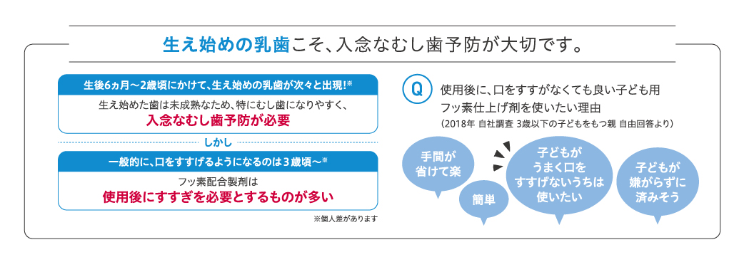 一般的に口をすすげるようになる3歳頃まで、使用後にすすぎのいらないフッ素仕上げジェルで予防することが望まれているのです。