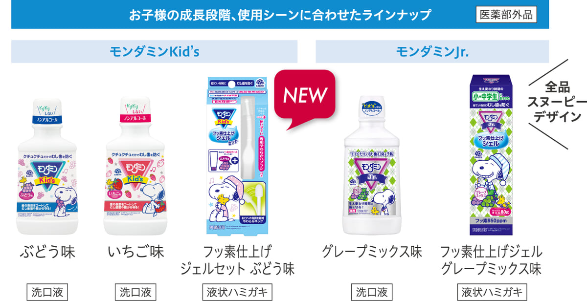モンダミンKid's、モンダミンJr.も全品スヌーピーデザイン!
