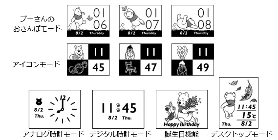 ほかにも、プーさんが蝶と遊びながらお散歩するさまざまなポーズを楽しめる「プーさんのおさんぽモード」や、キャラクターアイコンがランダムに切り替わる「アイコンモード」