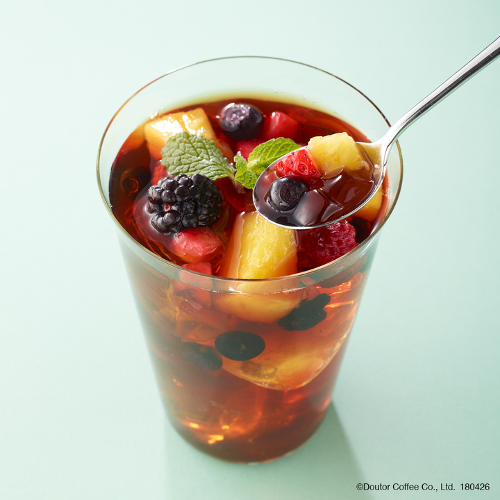 ごろごろっとしたカラフルなフルーツの香り、ティーゼリーのつるんとした食感、アイスティーのさっぱりとしたのどごしをお楽しみください。