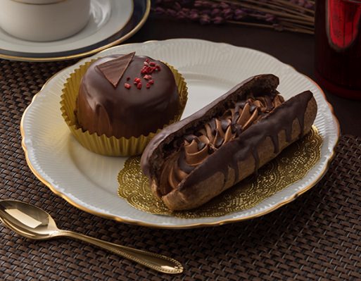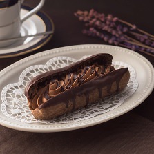ココアパウダーを配合して焼き上げたエクレア生地に、ハイカカオチョコレートを使用したチョコカスタードとチョコホイップの2種のクリームを絞り、チョコソースで飾ってあります。
