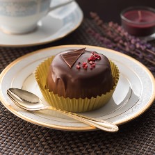 ココアスポンジとチョコムースをハイカカオチョコソースでコーティングし、チョコレートと砕いたフリーズドライ苺をトッピングしてあります。