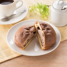 ココアケーキ生地を絞り焼き上げたパンに、チョコホイップとミルクホイップが絞ってあり、チョコチップのトッピングで仕上げてあります。