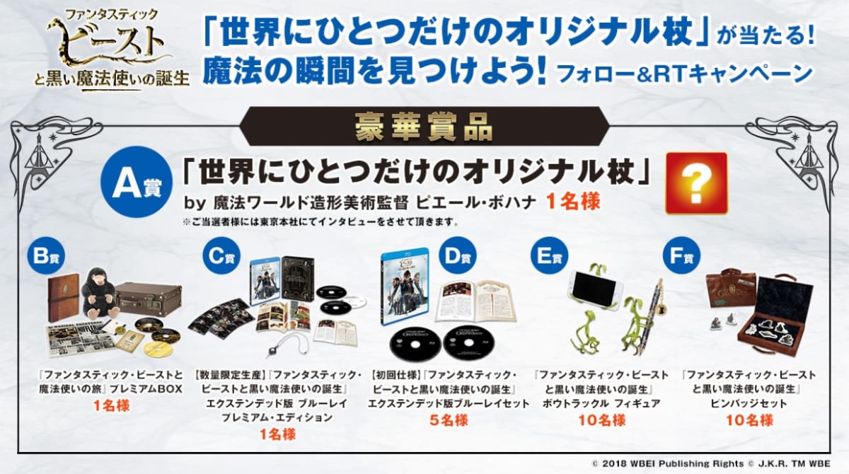 同キャンペーンでは、「ハリー・ポッター」、「ファンタスティック・ビースト」シリーズの造形美術監督を務める「ピエール・ボハナ」氏が、当選者のためだけに作る「世界にひとつだけのオリジナル杖」ほか豪華賞品が抽選で当たります!