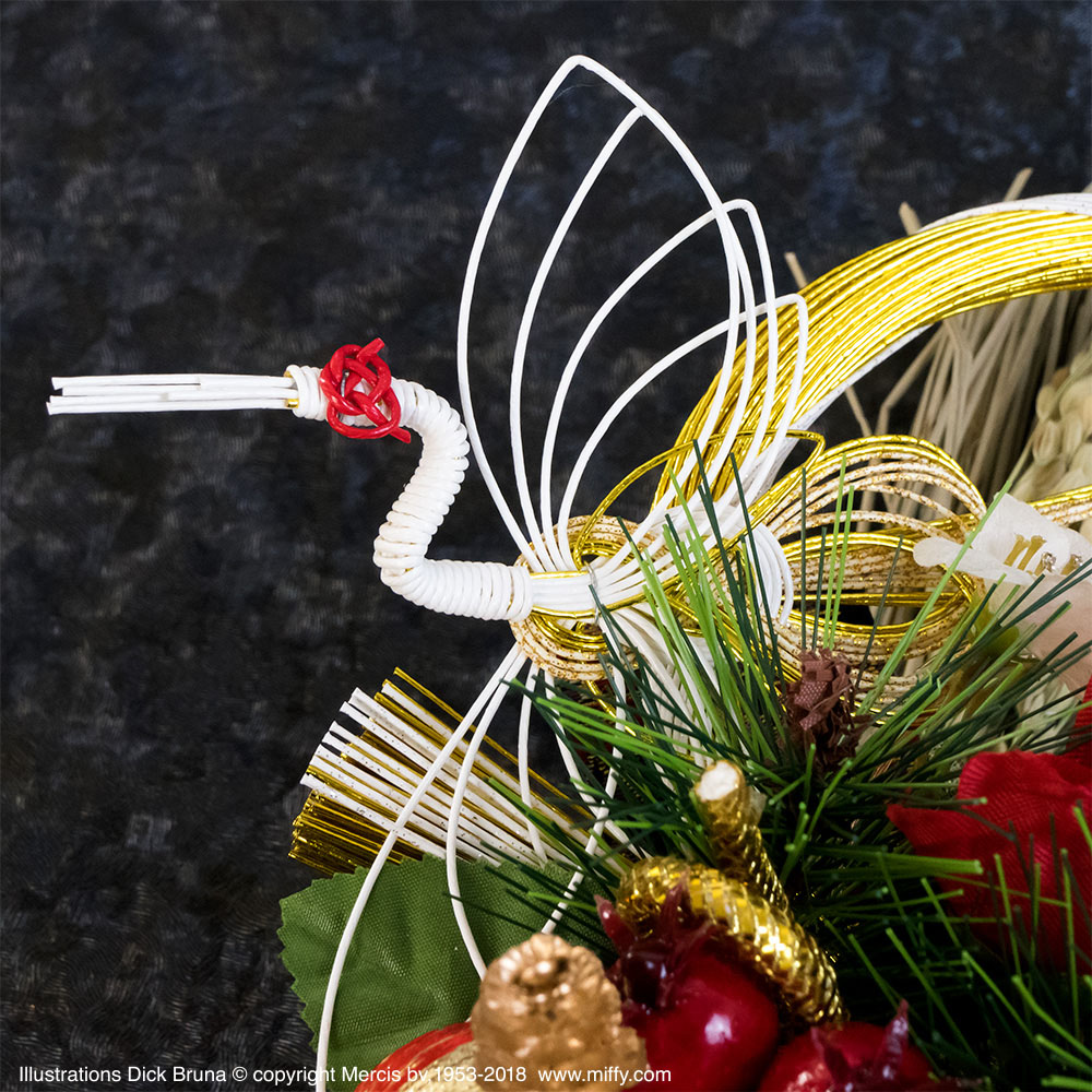 福だるまになったミッフィーぬいぐるみが鶴のお飾りと一緒にしめ縄を飾る豪華なお正月飾り。