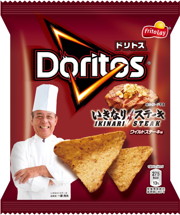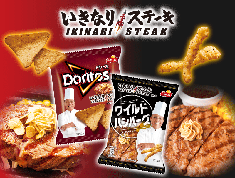 同店舗の5周年を記念して発売される「いきなり!ステーキ コーンスナック ワイルドハンバーグ味」と「ドリトス いきなり!ステーキ ワイルドステーキ味」は「いきなり!ステーキ」が監修を担当したスナック菓子です。