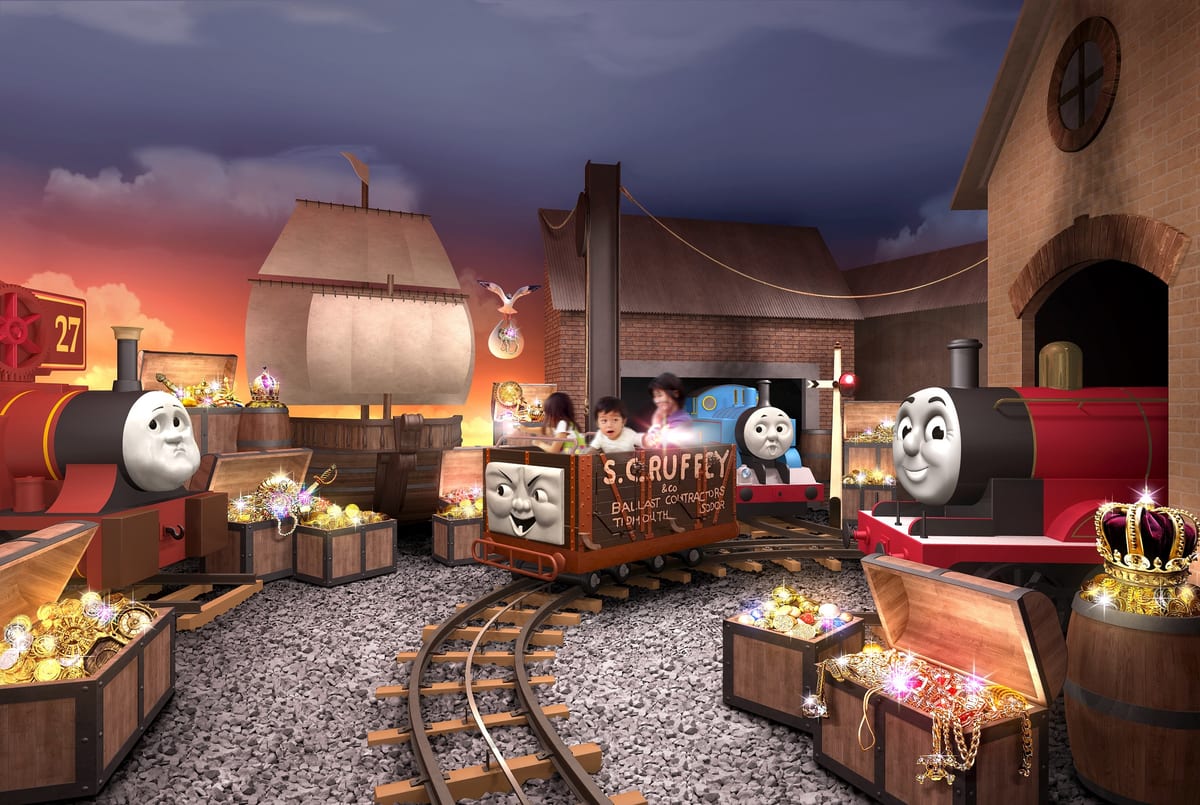 「トーマスランド」の新アトラクション「トーマスのたからさがし大冒険」は、ゲストが探検家となって貨車に乗り込み、トーマスと一緒にソドー島を巡りながらたくさんの「たからもの」を探す屋内型ライドアトラクション。