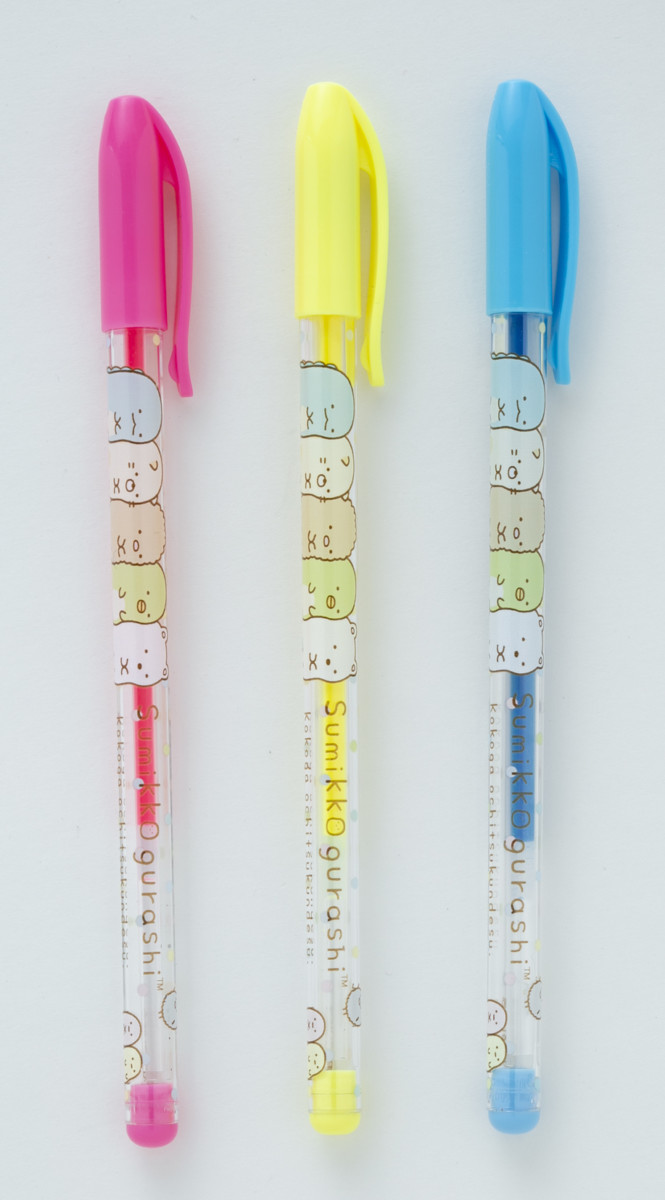 すみっコぐらしのキャラたちがきれいに並んだ蛍光色のボールペン3本セット。