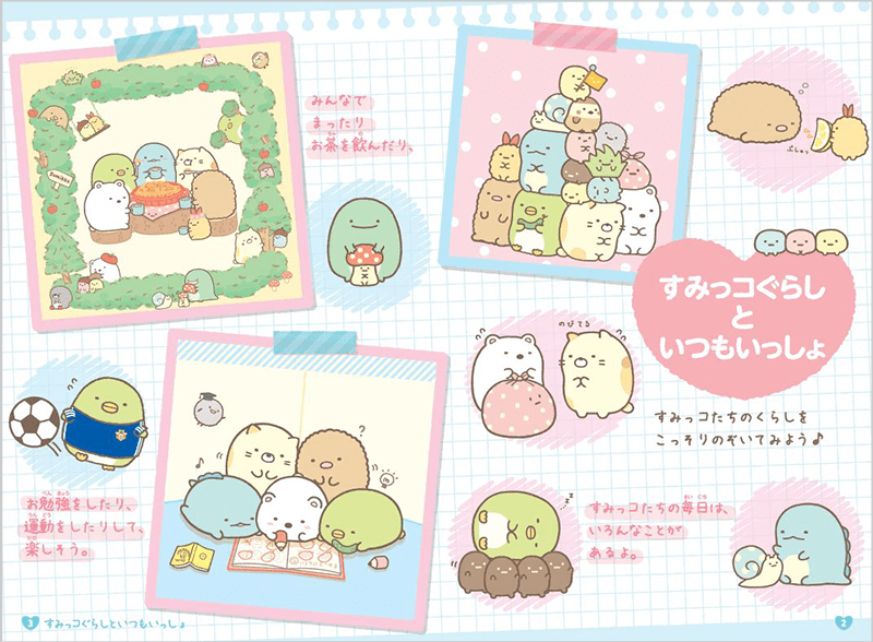 すみっコたちのカラーイラストがいっぱいで、眺めているだけでも楽しい気分になります。