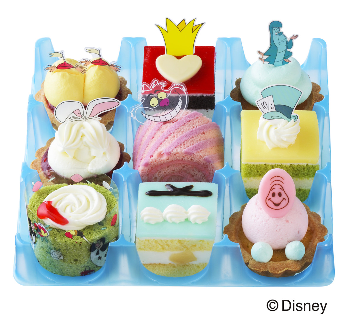 白桃ダイス入りライチムースのケーキ「アリス」や、ホワイトチョコクリームとラズベリージャムのタルト「白うさぎ」、ホワイトチョコクリームとココアスポンジのケーキ「ハートの女王」、全9種類の味わいが楽しめます。