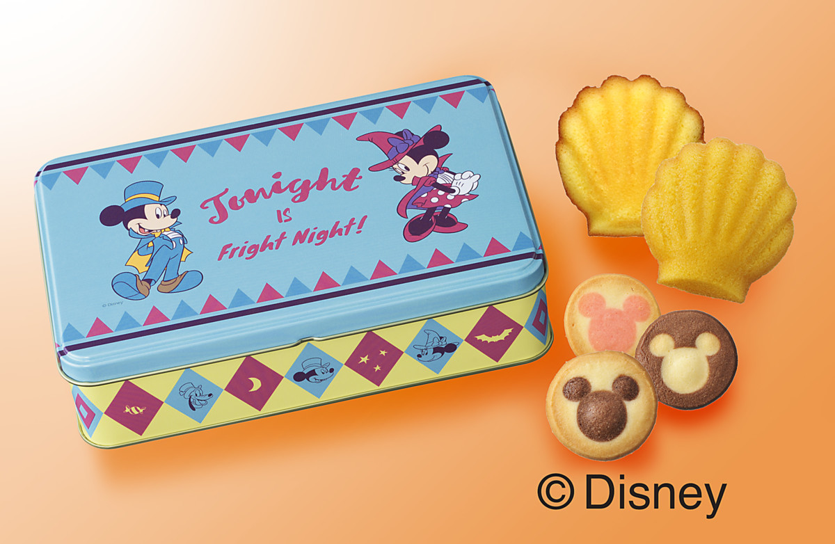 ハロウィンコスチュームのミッキー&ミニーを天面にデザインしたハロウィン限定の缶に、マドレーヌとかぼちゃマドレーヌ、ミッキーのシルエット柄クッキー3種を詰め合わせ。