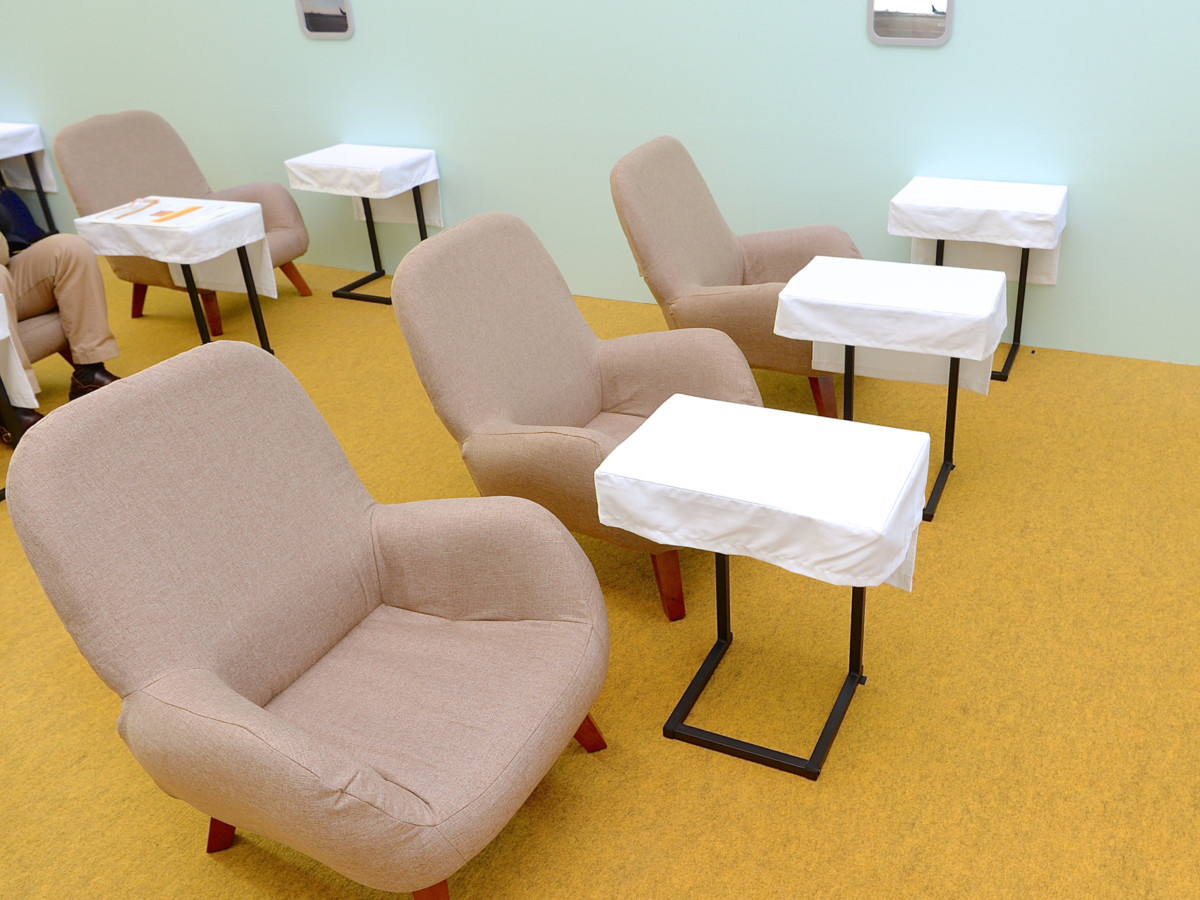 空港のチェックインカウンターに見立てた窓口でチケットを受け取り、会場内に入ると、そこは航空機内のような空間が広がっています。