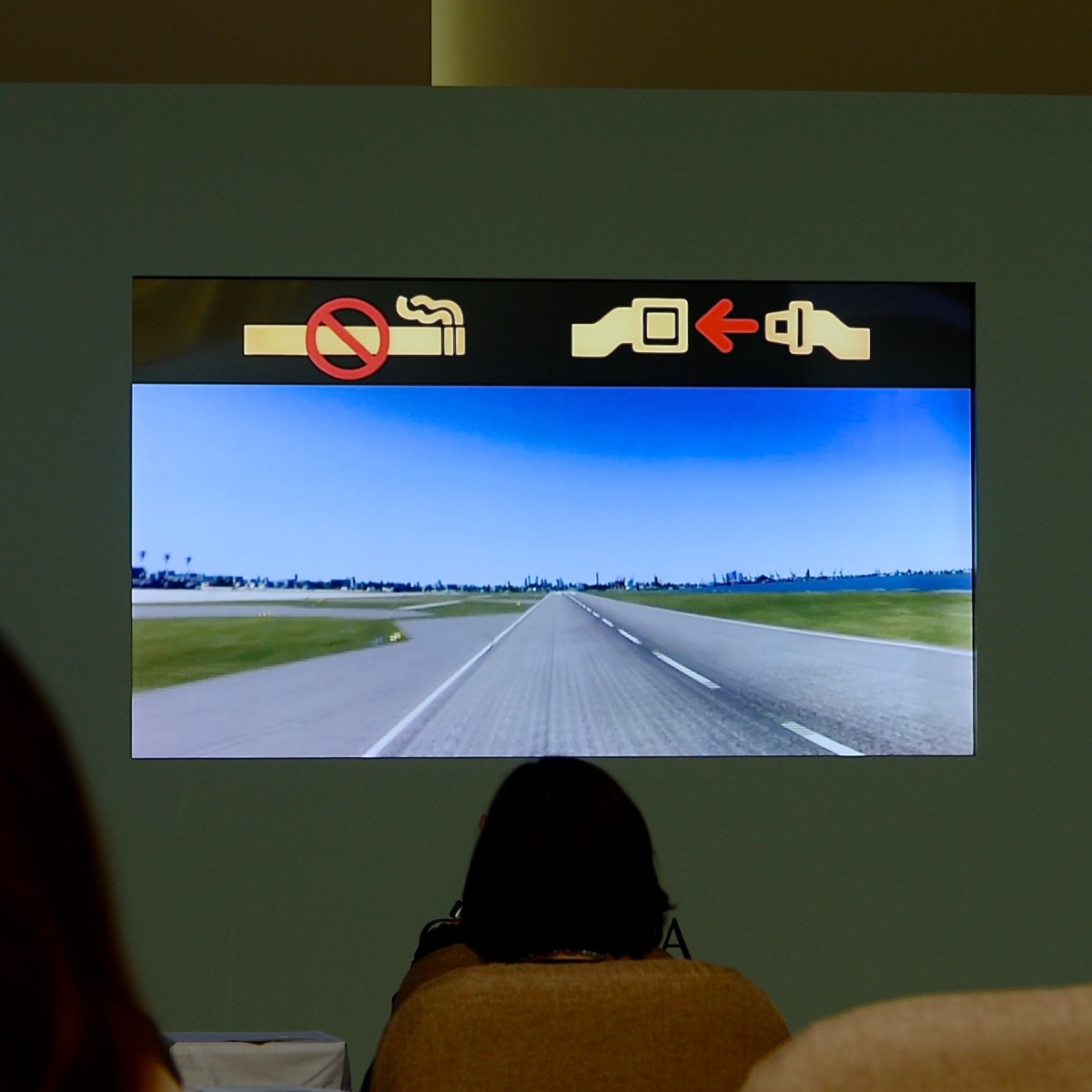 スクリーンに飛行機が離陸する様子が映しだされ、まるで本物のフライトを体感しているような雰囲気に☆