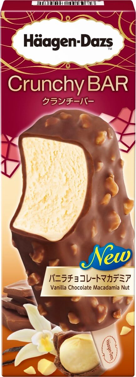 バーといえば、バニラアイスクリームとアーモンドを組み合わせることが多いですが、クランチーバー『バニラチョコレートマカデミア』はカリカリ食感が人気のマカデミアナッツがふんだんにトッピングされています。