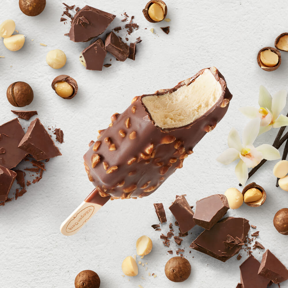 甘く華やかなバニラアイスクリームとチョコレートが溶け合い、マカデミアナッツのカリカリの食感がアクセントとなった、ハーゲンダッツならではの王道の味わいです。