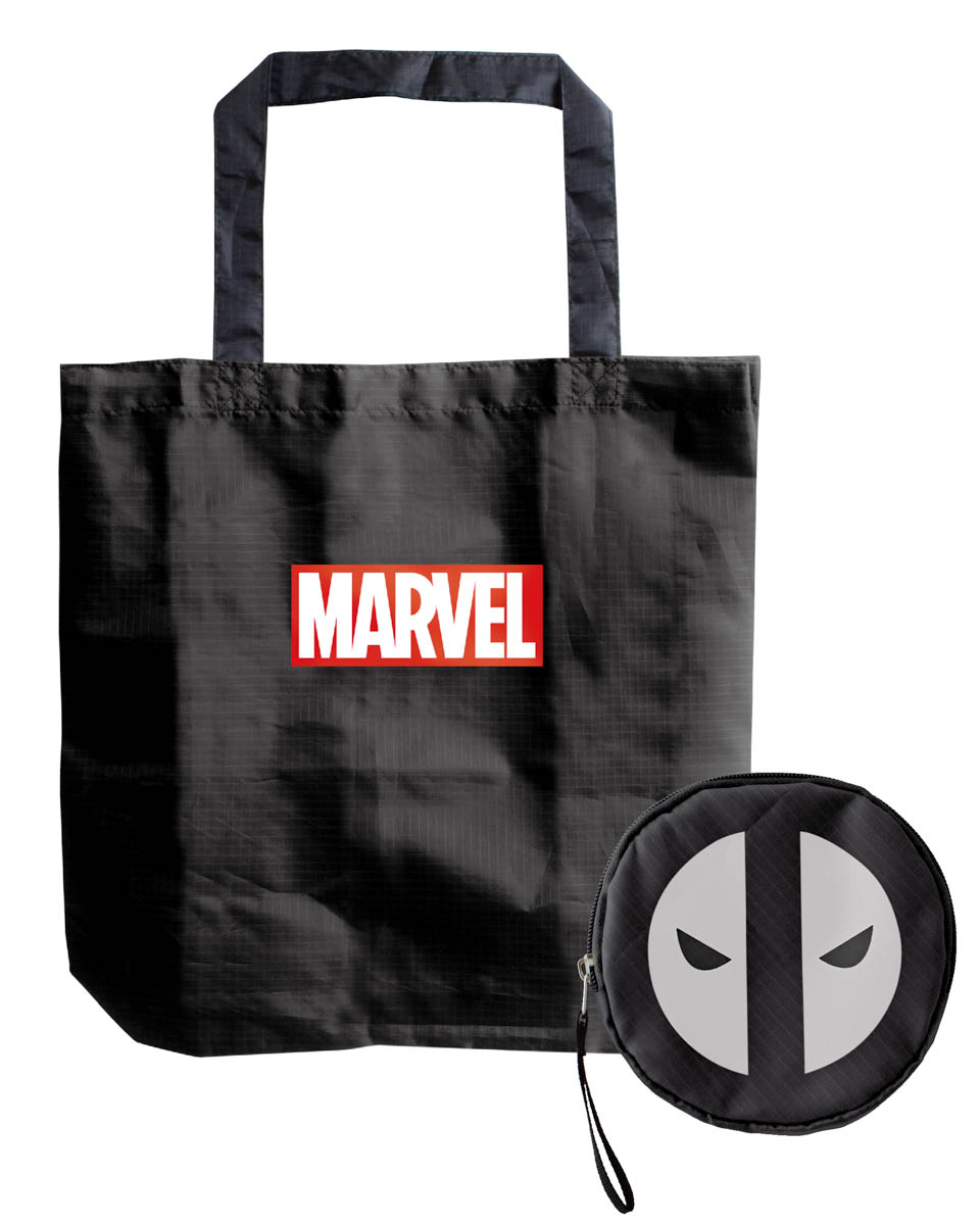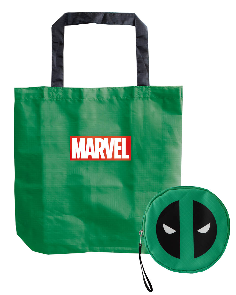デッドプールのフェイスマークデザインのポーチに入った、MARVELロゴトート。