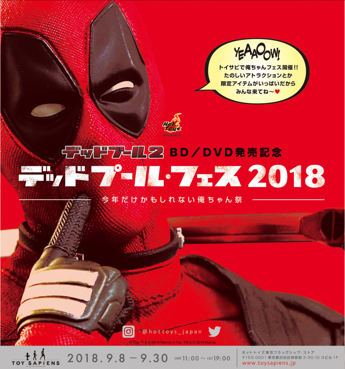 「デッドプール2」のBlu-ray&DVD発売を記念した、「デッドプール・フェス 2018 〜今年だけかもしれない俺ちゃん祭〜」は原宿トイサピエンスにて2018年9月8日(土)〜30日(日)の期間限定でオープンです!