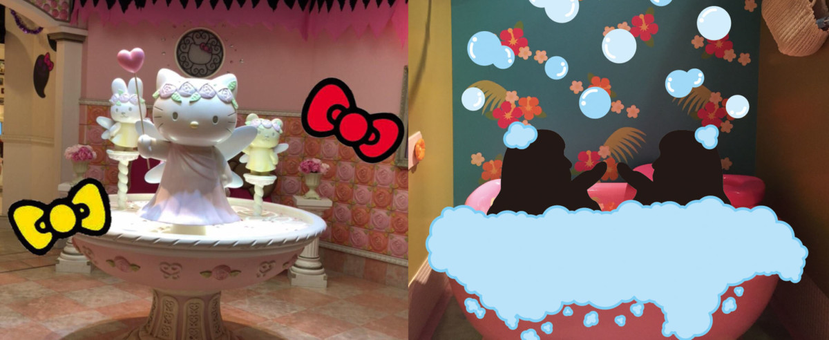(写真左)エントランスではキティとミミィのリボンが出現!