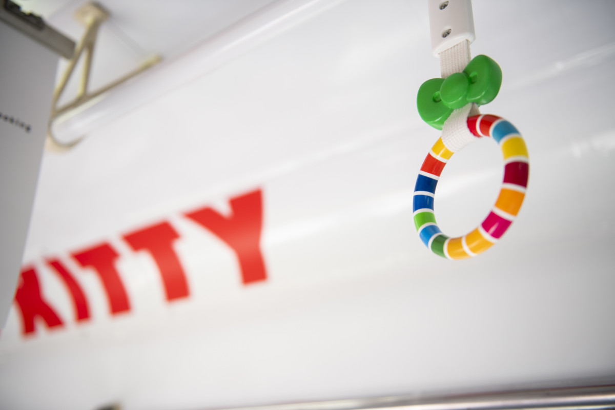 シートに座るキティちゃんの衣装は、今回の企画のためにデザインされたカラフルでスタイリッシュなワンピースなど。
