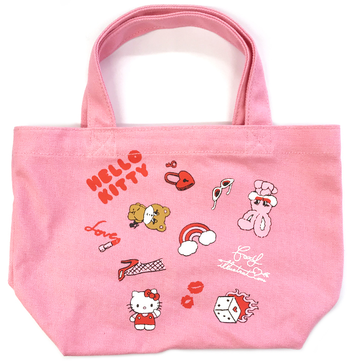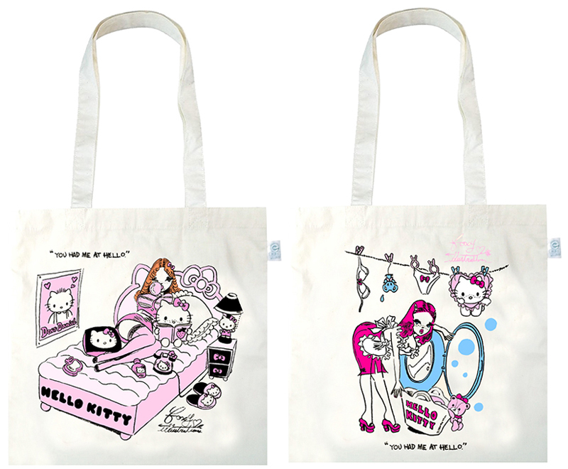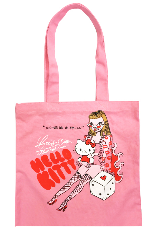 ちょっぴりセクシーでガーリーな女の子が「ハローキティ」を抱えたデザインが施されたトートバッグ。