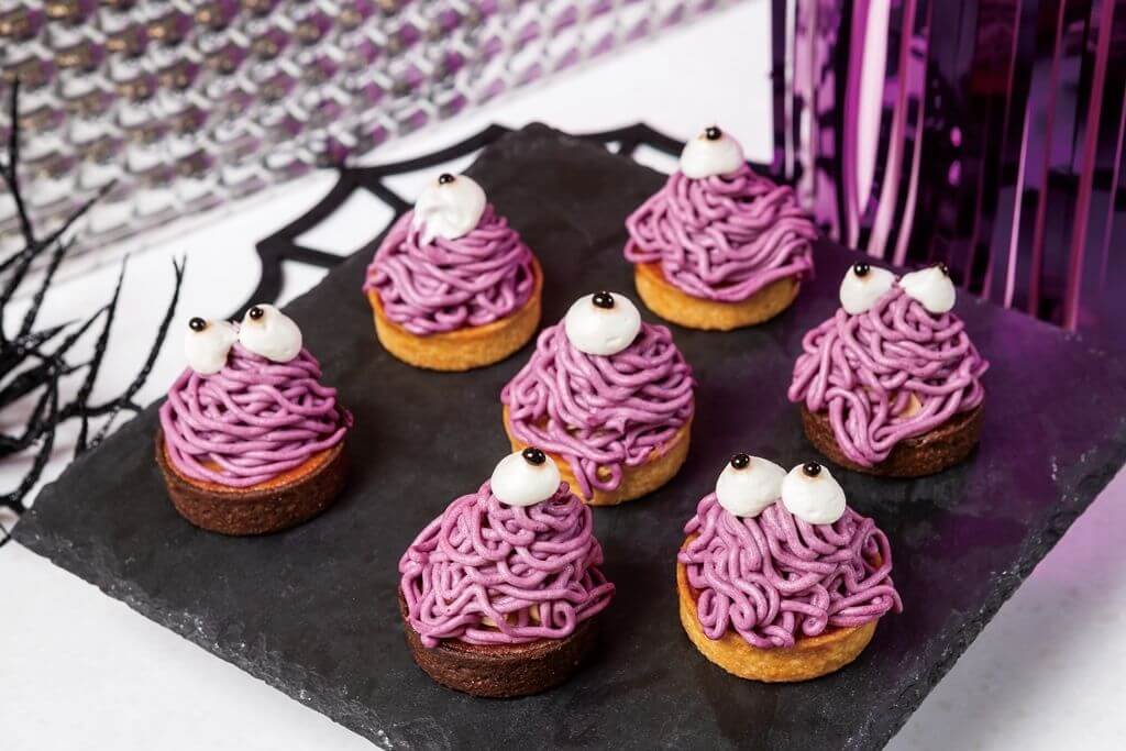 紫芋を使用したクリームがまるでもじゃもじゃゴーストのように盛られており、てっぺんに目玉をあしらったクリームを絞ってあります。
