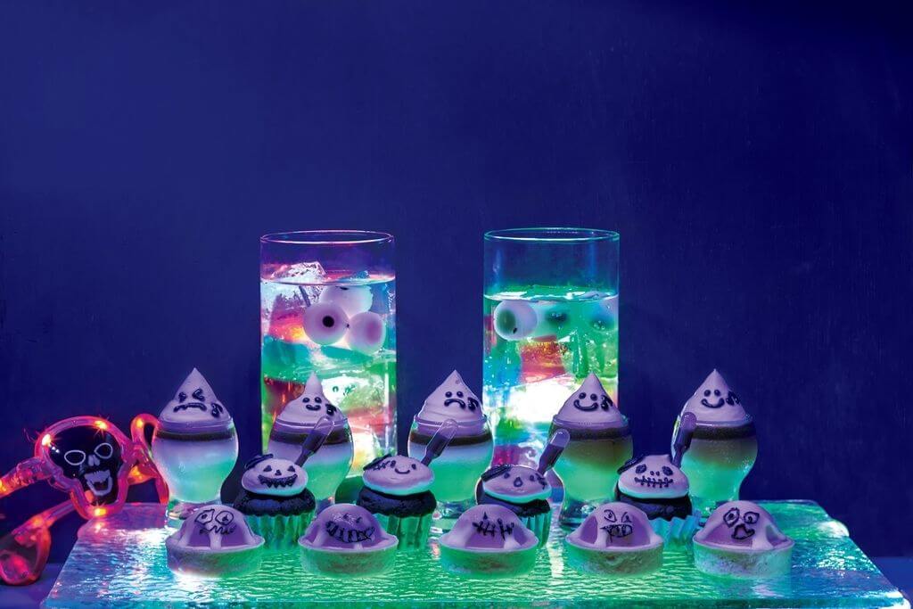 ブラックライトに照らされたハロウィーン・ディスコフロアで、おばけたちが妖しく光ります。