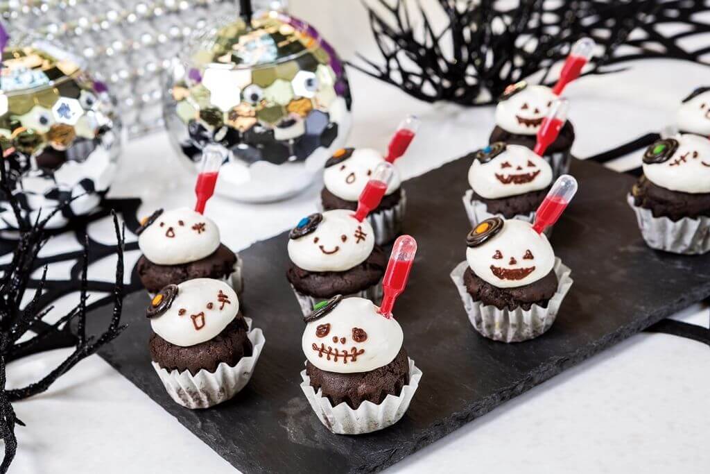 ブラックココアを使用した少し苦味のあるカップケーキに生クリームをのせ、ひとつずつ丁寧に、チョコレートソースでゾンビの顔を描いたスイーツ。