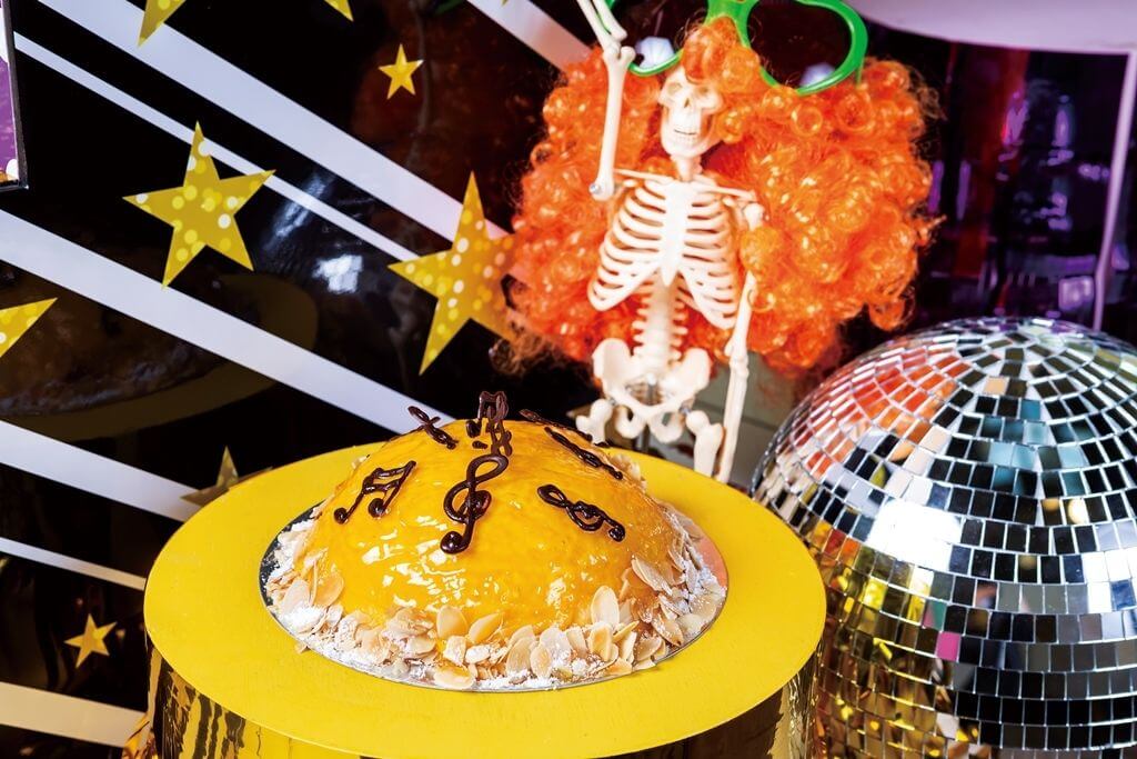 秋の味覚の代表、さつまいもペーストと牛乳などで作ったゼリーの上に、ほろ苦いキャラメルソースが重ねられており、その上にディスコミュージックでダンスするおばけたちが生クリームとチョコレートで描かれています。