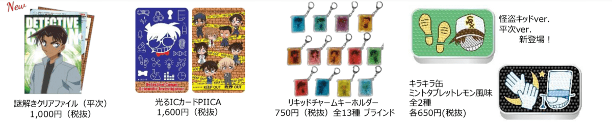 また、大阪会場では、新アイテムの服部平次ver.「謎解きクリアファイル」や13種の「リキッドチャームキーホルダー」、「光るICカードステッカー」、「キラキラ缶 ミントタブレットレモン風味」の服部平次・怪盗キッドver.をはじめ、青山剛昌先生描き下ろしの「複製ミニサイン色紙」付きガイドブック、白手袋や捜査手帳などオリジナルアイテムが登場し話題を集めています。