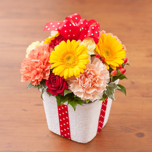 プレゼントボックスをイメージしたアレンジメントは、バルーンに合わせて元気いっぱいビタミンカラーの黄色・オレンジ系の花々でまとめられ、赤の水玉のリボンで華やかさをプラス。