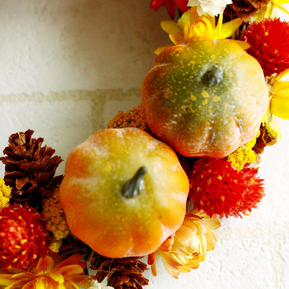 秋の収穫の喜びが詰まった、オレンジや黄色のハロウィーンカラーの花々や木の実があしらわれたミツマル型のリースです。