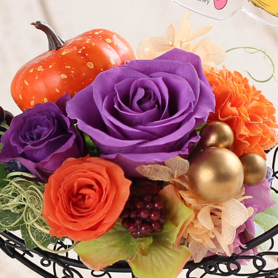 「ハロウィーンの魔女(ミニー)」は、パープルのバラをメインに秋の収穫の喜びが詰まったオレンジの花々や実もののアレンジメント。
