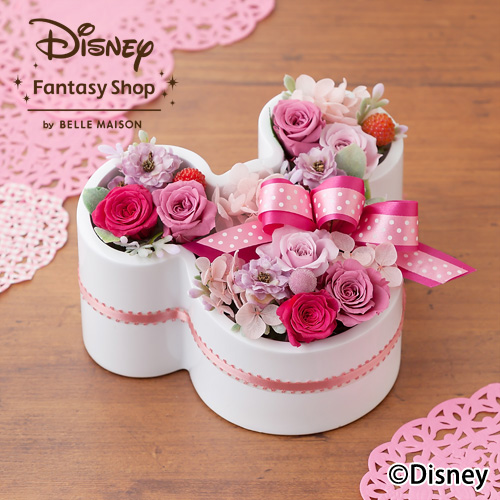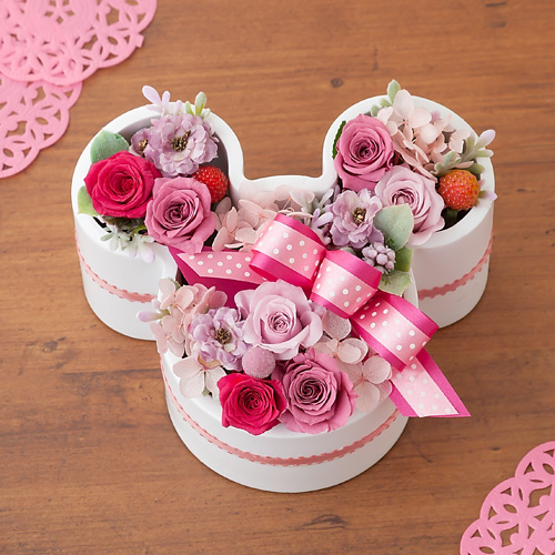 女性に人気のベビーピンクから赤のグラデーションのプリザーブドフラワーのバラやアジサイ、アクセントに実ものをたっぷりと、ミニーのシルエットをした花器にまとめたアレンジメント。