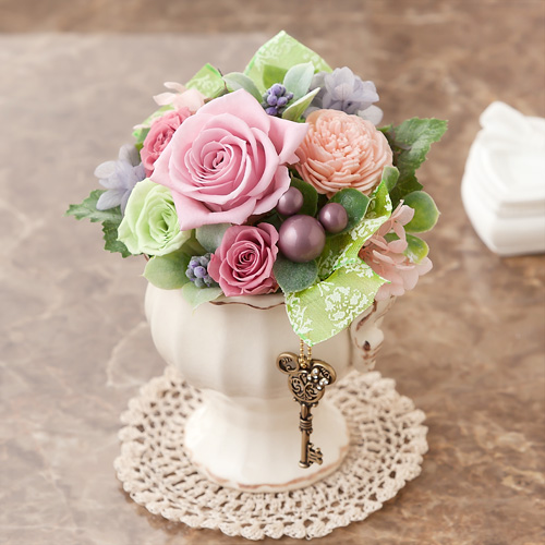 優しい色合いのアレンジメントにそっと添えられた小さな一つの鍵。