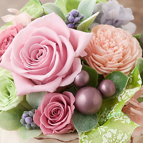 あでやかに咲き誇るラベンダーピンクのバラやマスカットグリーンのバラ、実ものを、白地に風合いのある縁取りがお洒落な花器に活けた華やかなプリザーブドフワラーのアレンジメントです。