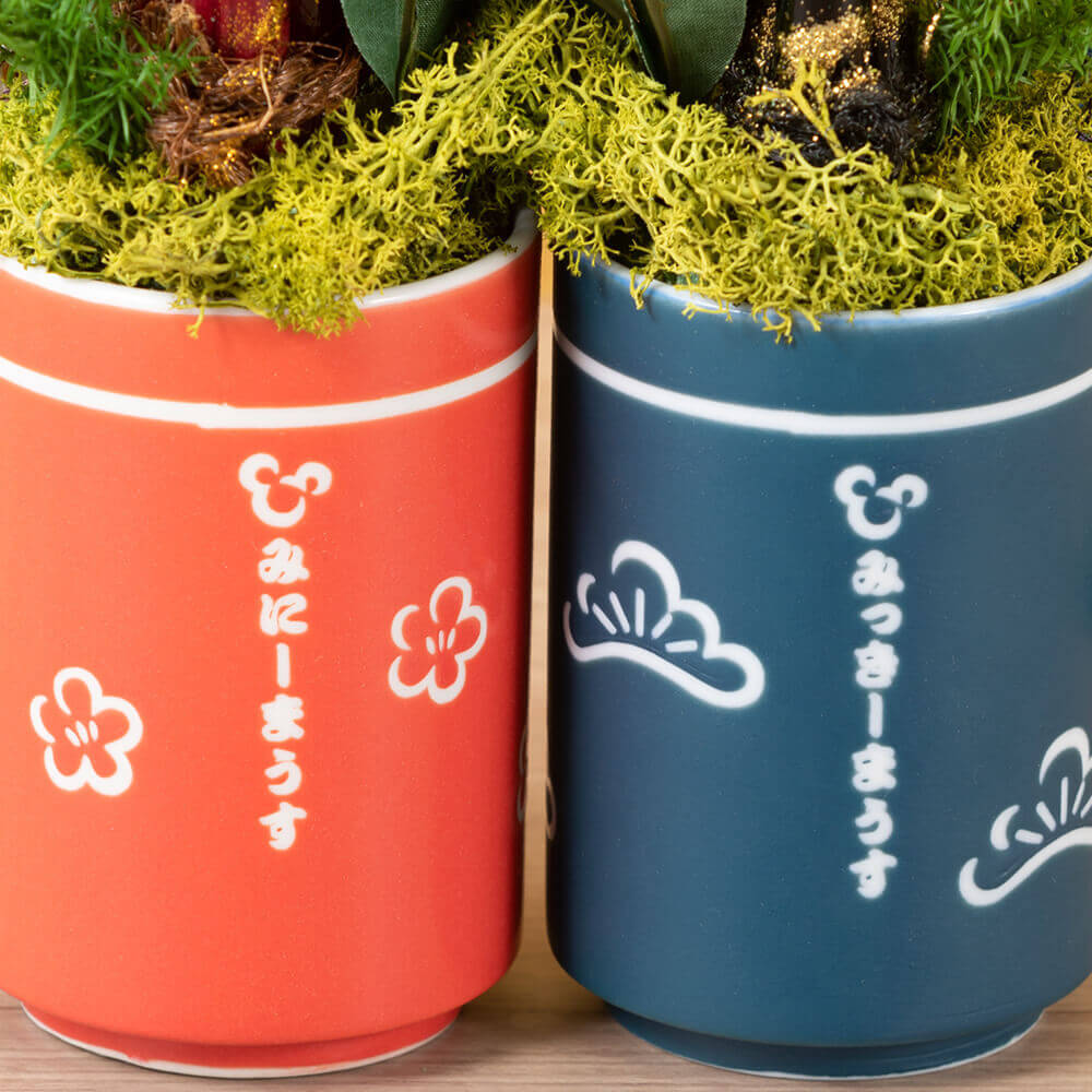 ディズニーの人気キャラクター「ミッキーマウス」と「ミニーマウス」の器に、それぞれの器に合わせた色合いのお正月にふさわしい花々がアレンジされています。