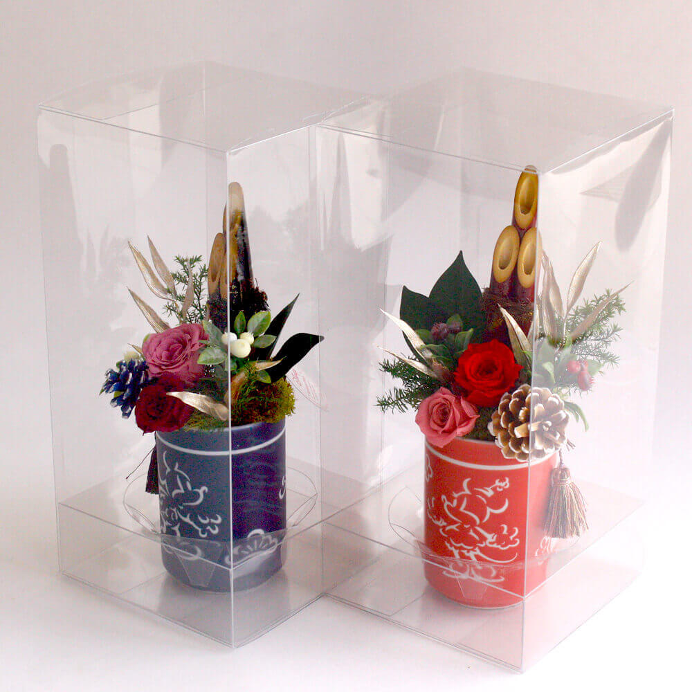 “門松”といえば戸外の迎春飾りですが、こちらは、プリザーブドとアートフラワーで作られた、大人気の室内用の門松飾り。