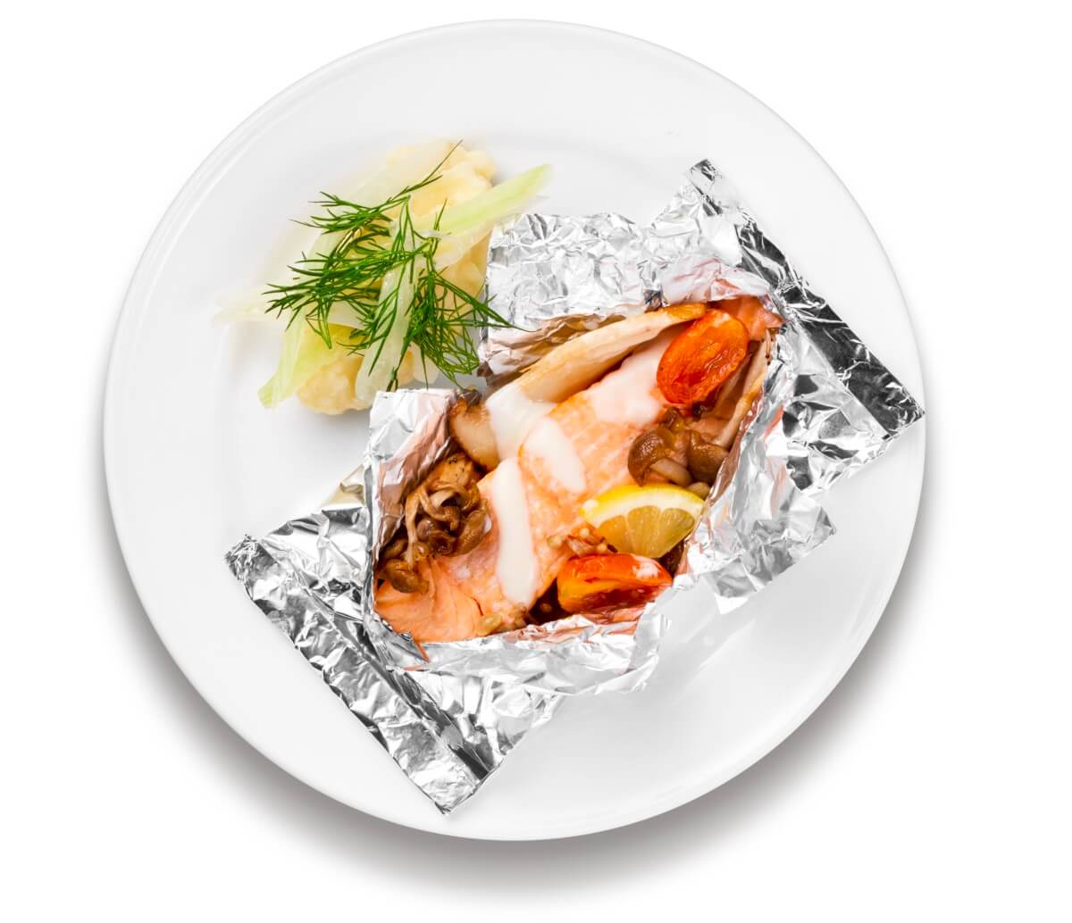サーモンと野菜をホイルで包み、焼き上げた料理。