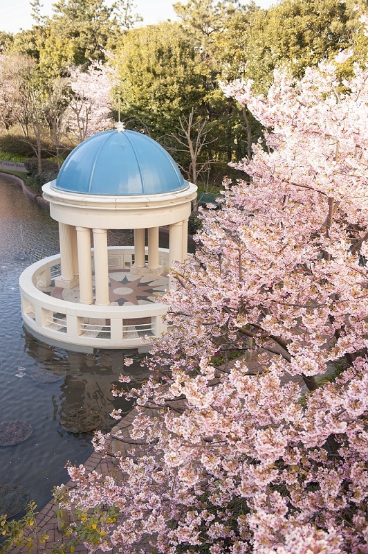 東京ディズニーリゾートⓇ内の商業施設「イクスピアリ」に併設された「オリーブと噴水の広場」に植樹されている『河津桜』が咲きはじめました。
