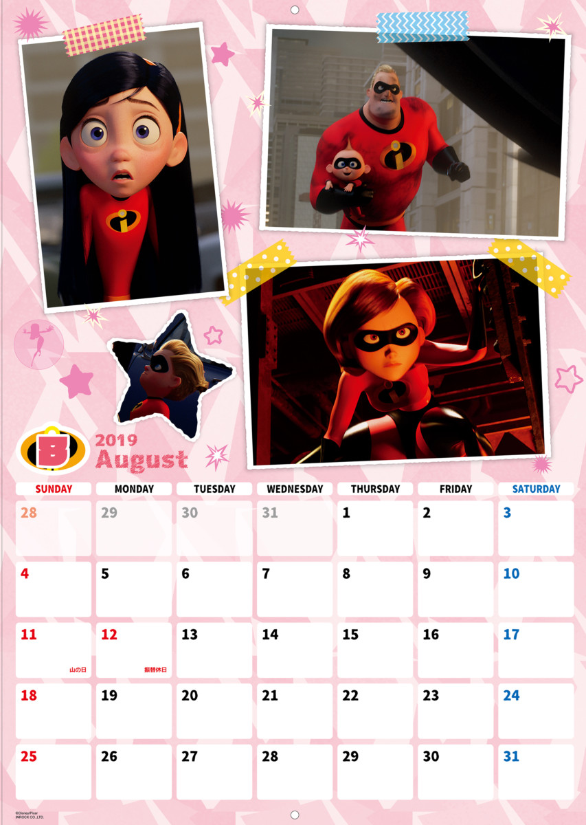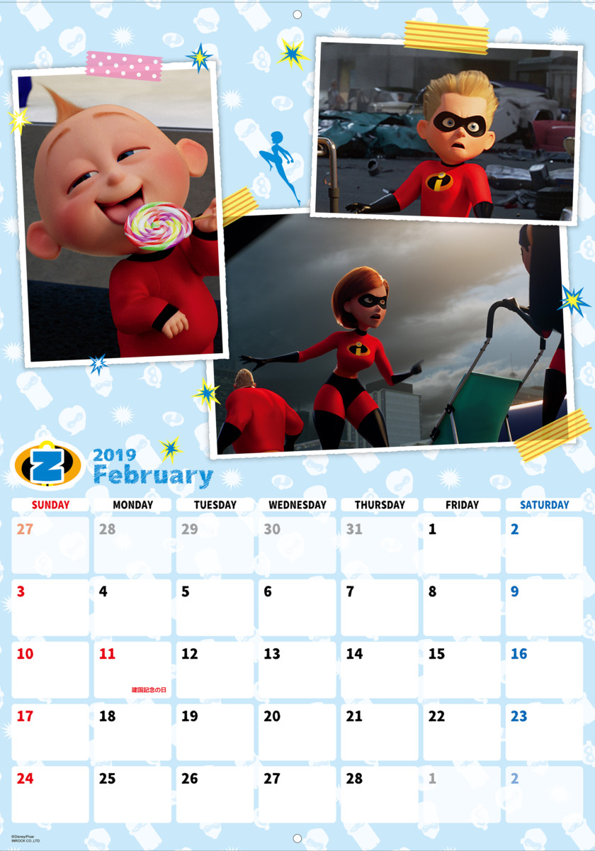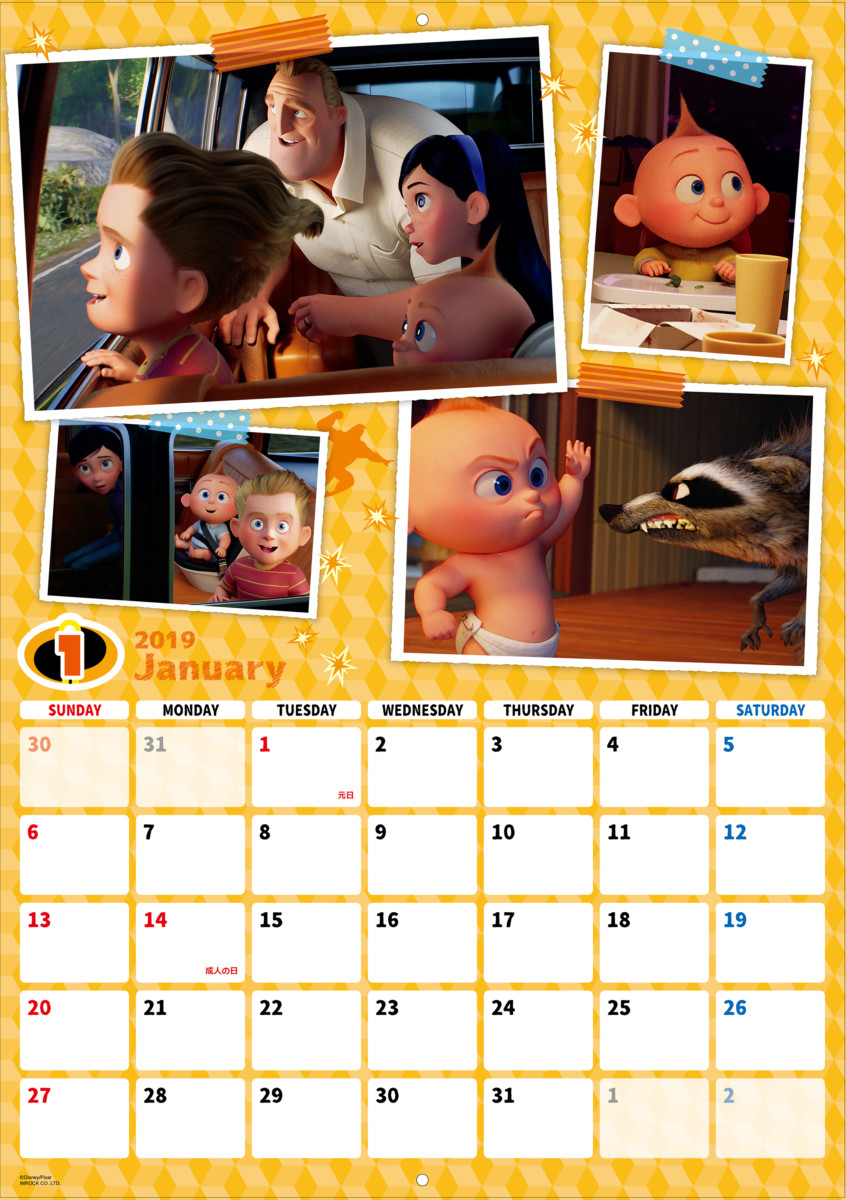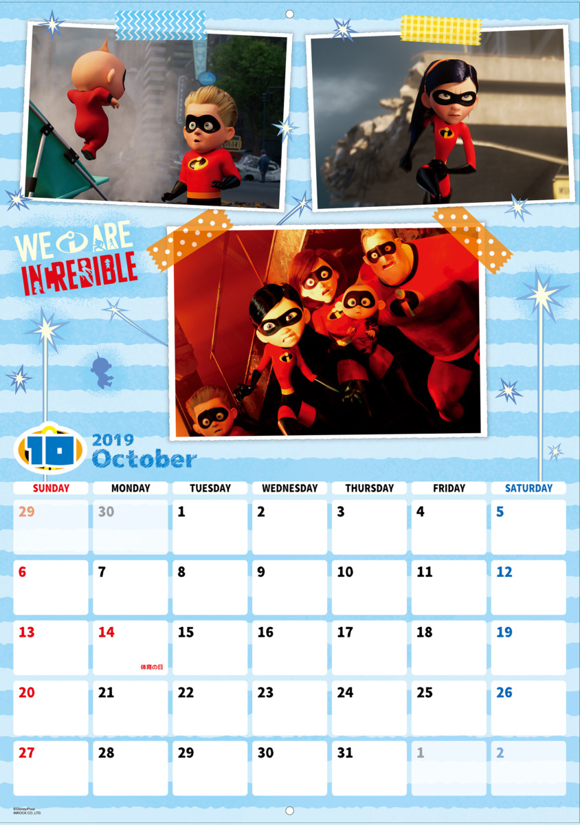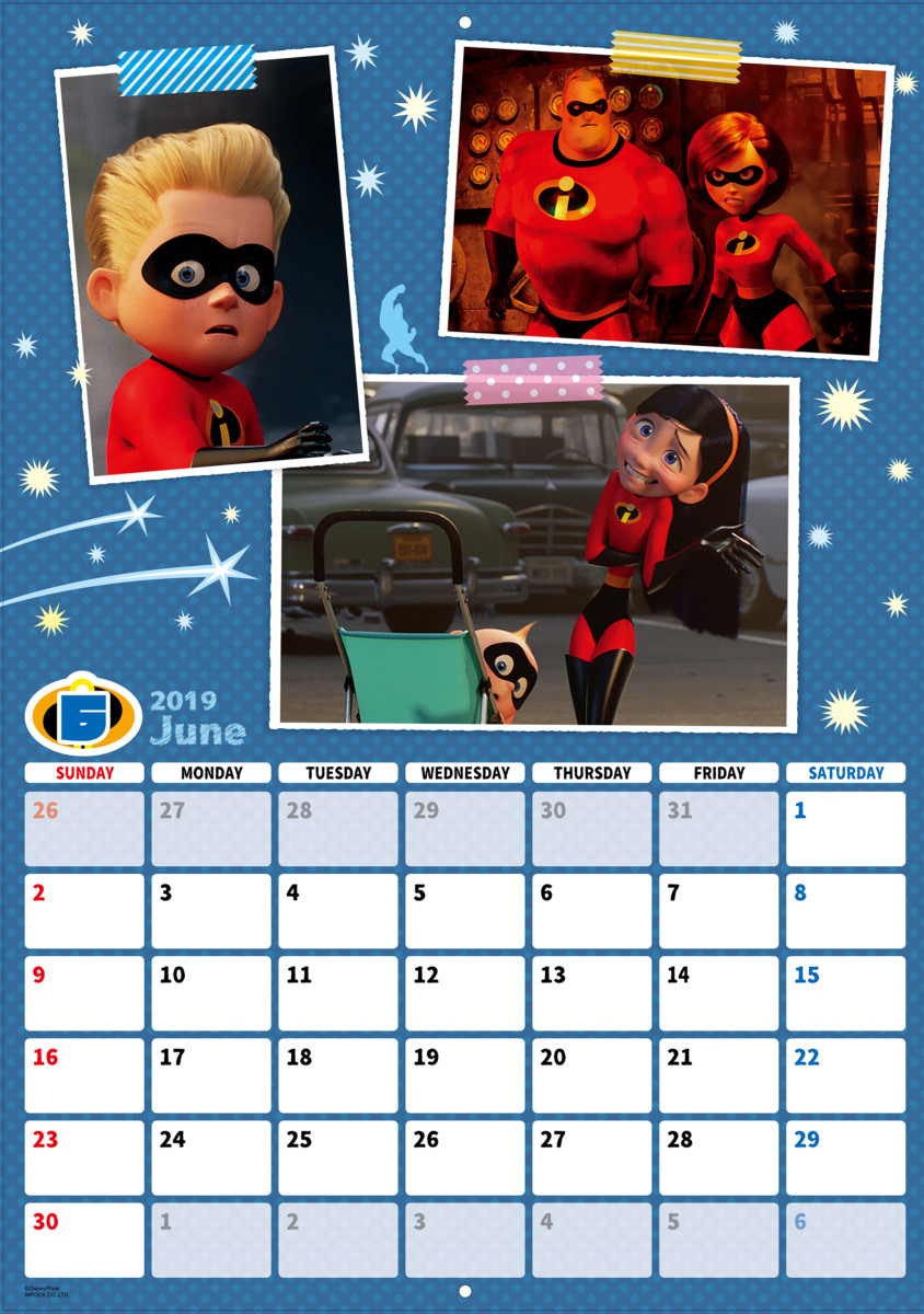 ひと月ごとに区切られた「インクレディブルファミリー」デザインの2019年版カレンダー。