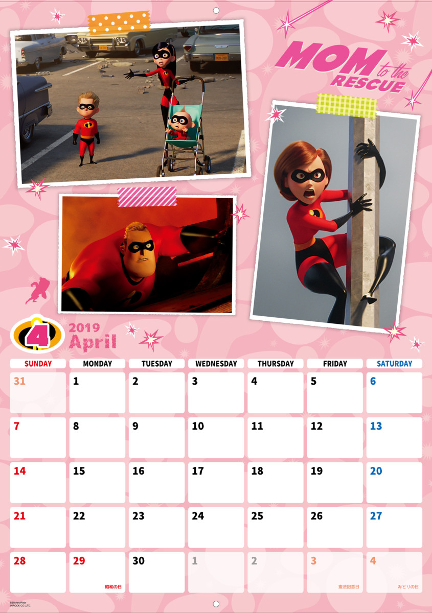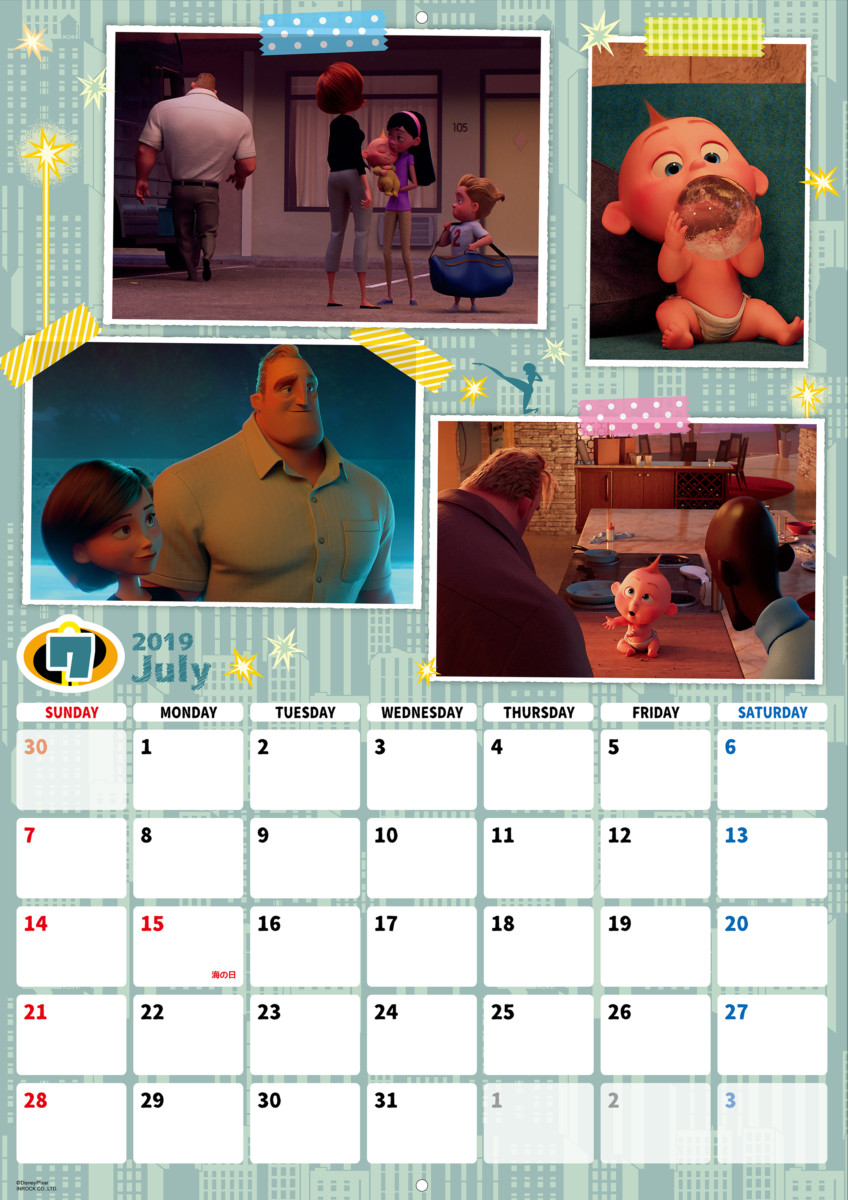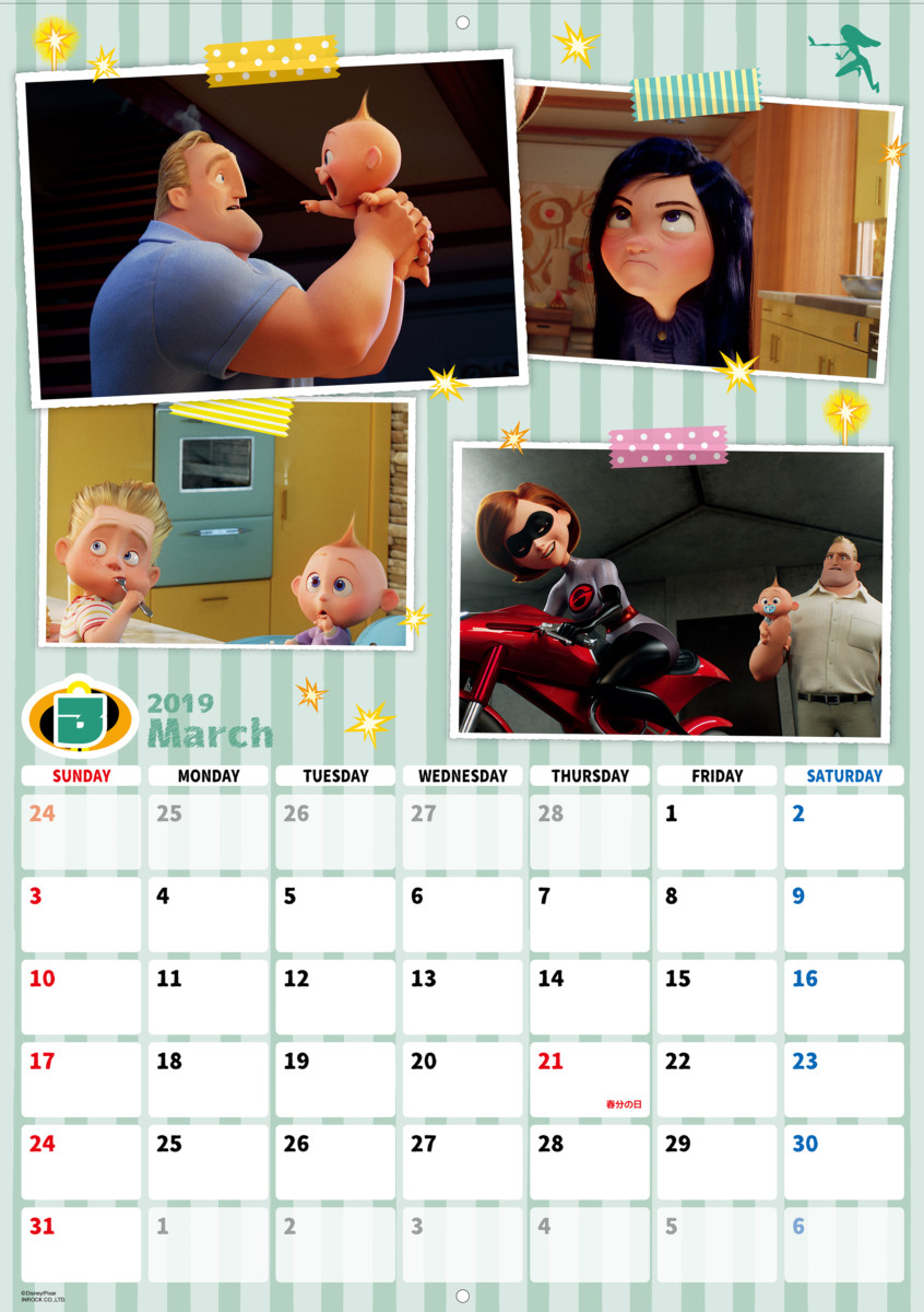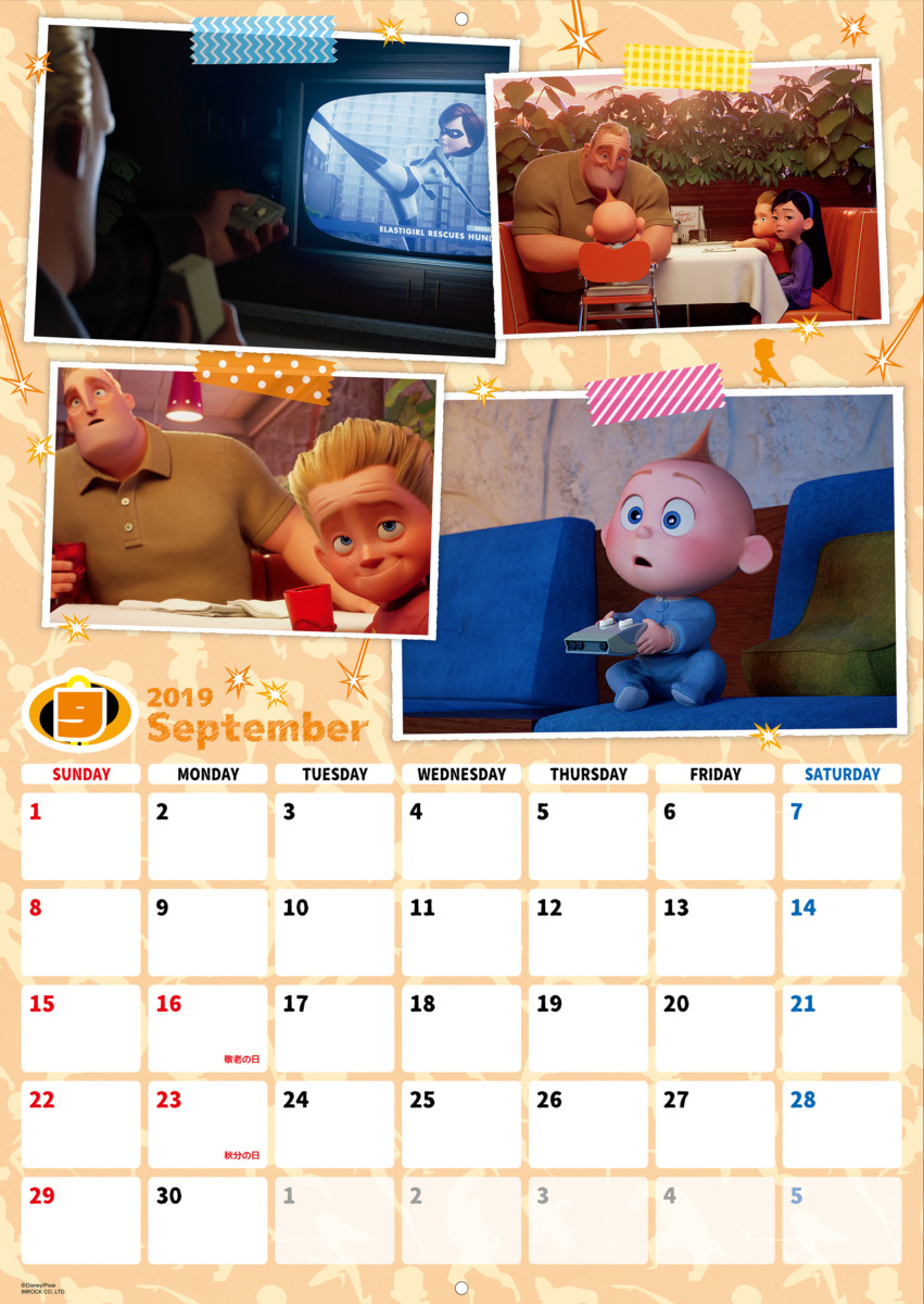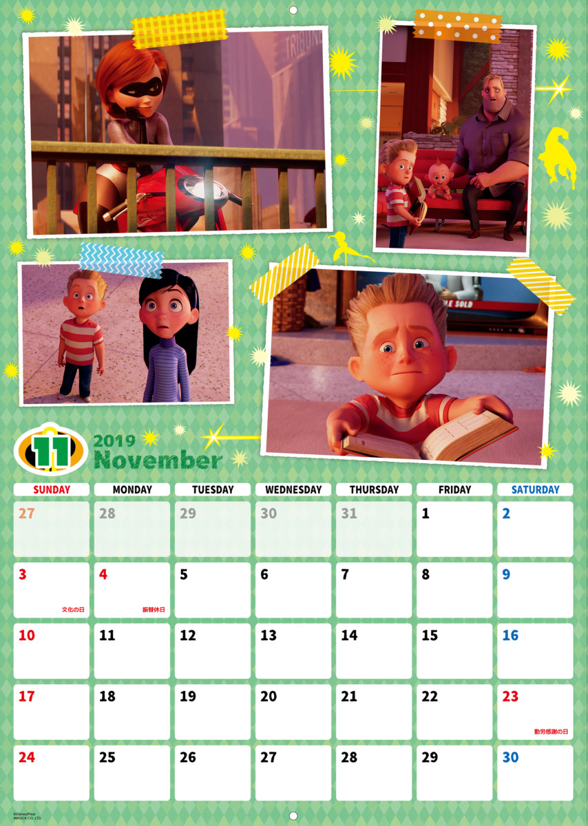 ひと月ごとに区切られた「インクレディブルファミリー」デザインの2019年版カレンダー。
