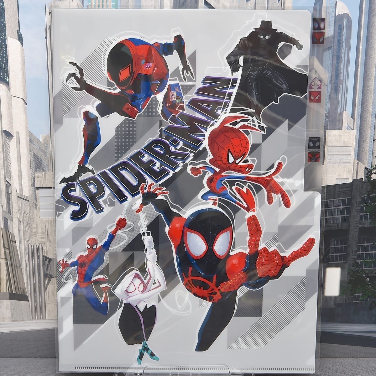 見開きタイプのクリアファイルに『スパイダーマン:スパイダーバース』に登場するキャラクターたちがプリントされた「Wポケットクリアファイル」
