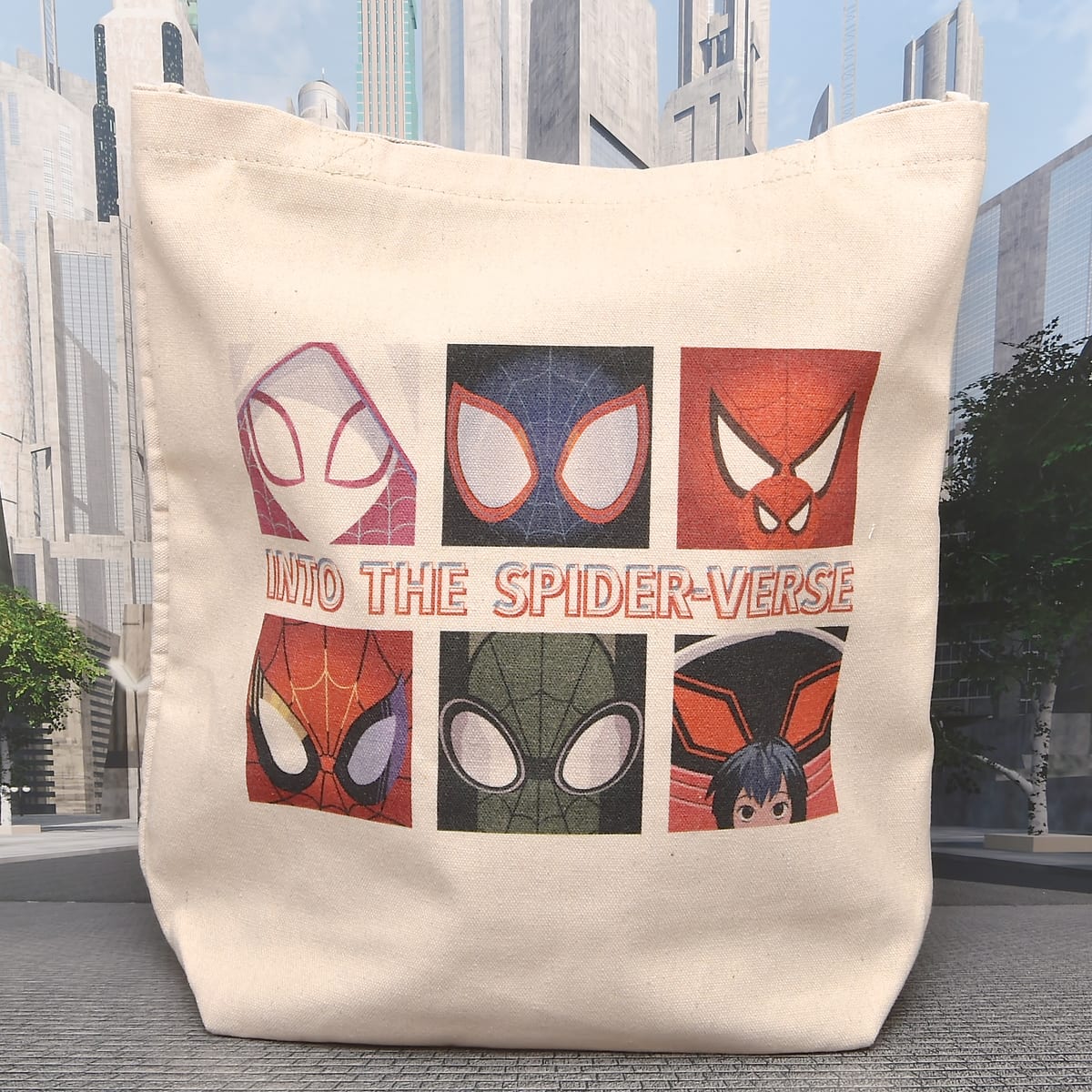 等間隔に「スパイダーマン」たちのフェイスラインが大きくプリントされた「トートバッグ」