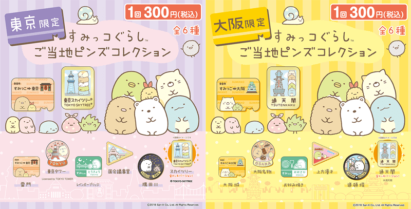 カプセルトイ「すみっコぐらしご当地ピンズコレクション」の東京限定版は東京都各地の土産物店、KOGUMA池袋 ショッピングパーク店、東京ソラマチご当地ピンズプラスにて、大阪限定版は大阪府各地の土産物店、通天閣、博品館TOY PARK関西空港店、キャプテンラインにて好評発売中です。