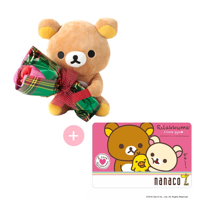 ソープフラワーを持ったリラックマのぬいぐるみと限定ナナコカードの、クリスマスギフトにもぴったりのセットです!