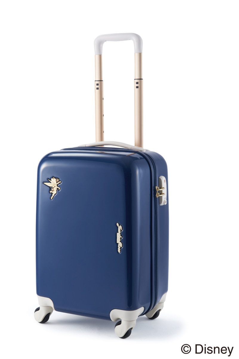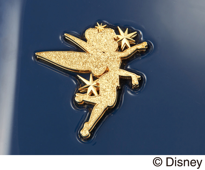 夜空をイメージしたネイビーのスーツケースのボディにはパール加工が、バッジにはラメ加工が施され、ティンカー・ベルの煌めきが表現されています。
