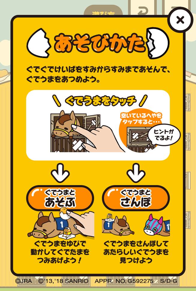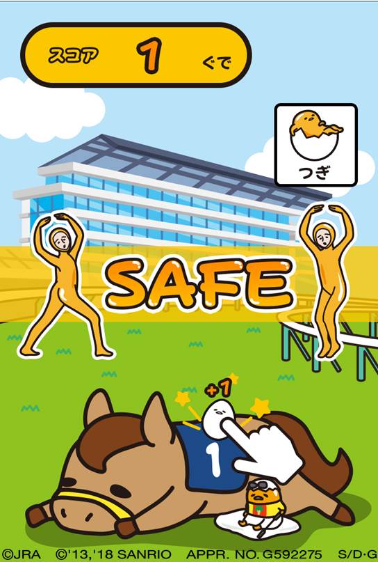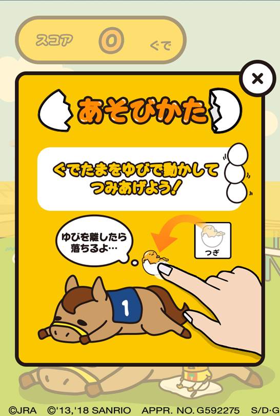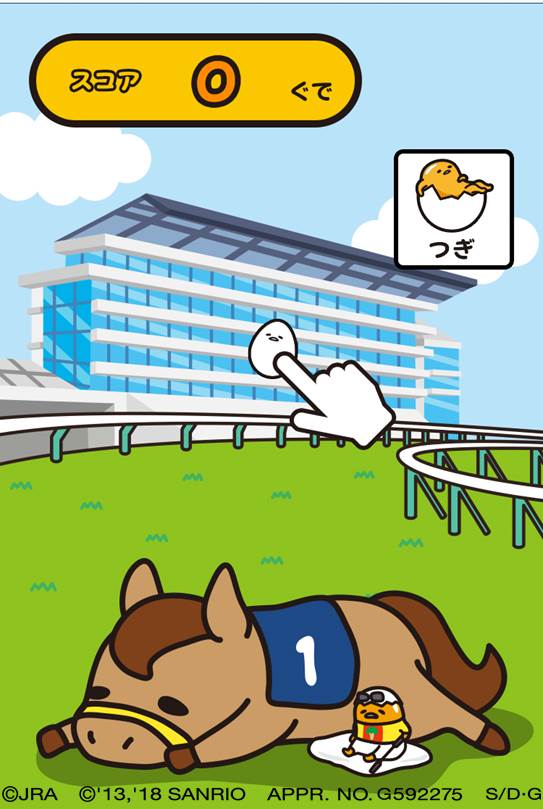コンテンツの一つである「ぐでうまとあそぶ」は、競馬場で“ぐで”ている「ぐでうま」の上に、様々な種類の「ぐでたま」をたくさん乗せてスコアを競うゲームです。