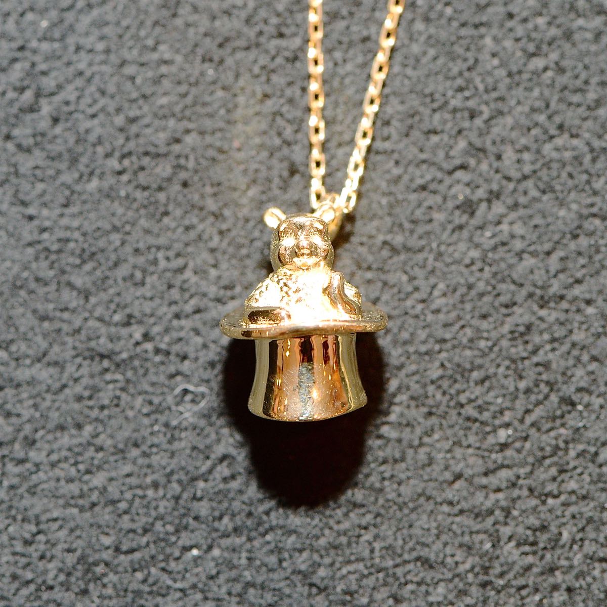 英国紳士に似合いそうなハットにすっぽりとおさまったフィギュアのようなプーさんがかわいらしいネックレス。
