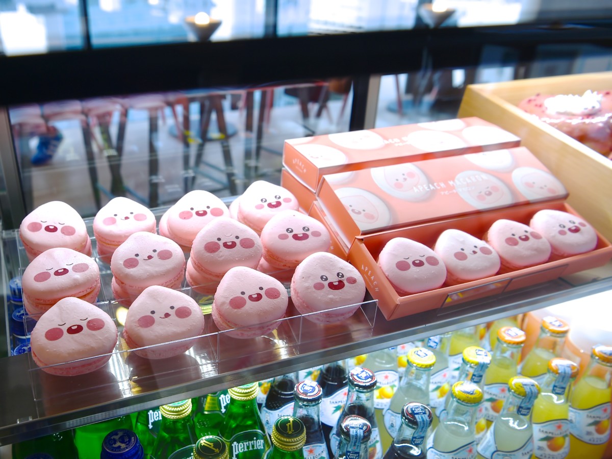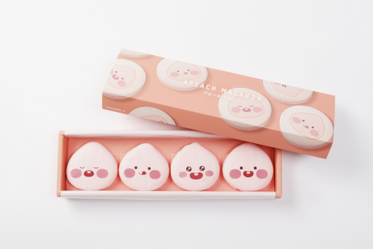 テイクアウト限定で販売される「ちびアピーチ」のお顔があしらわれたマカロン。