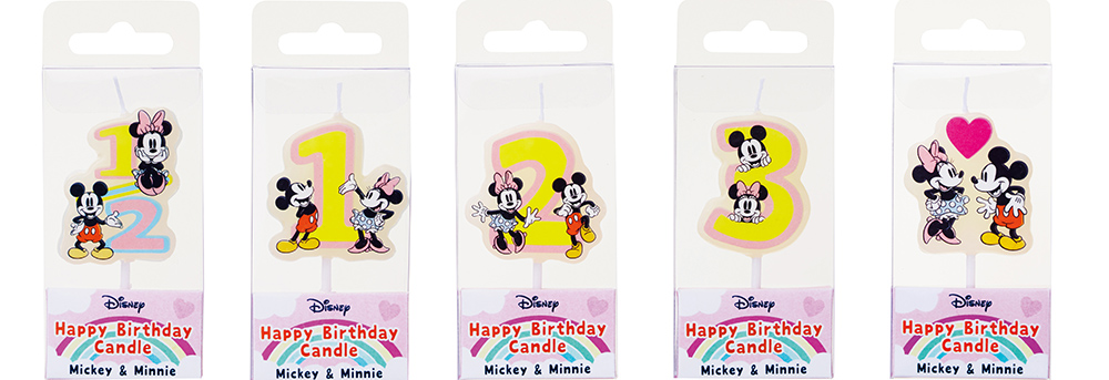 ミッキーとミニーがナンバーのまわりでたわむれるポップで楽しいキャンドルです。